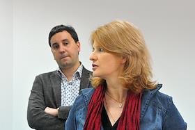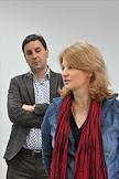 Генеральный директор компании "Инфовоч" (InfoWatch)Наталья Касперская (слева) и президент группы QIWI Андрей Романенко (справа) во время интервью.