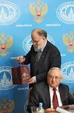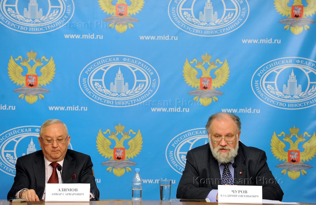 Председатель Центральной избирательной комиссии (ЦИК) России Владимир Чуров (слева) и посол по особым поручениям Министерства иностранных дел (МИД) России Анвар Азимов (справа) во время пресс-конференции на тему: "Итоги работы миссий по международному наблюдению за выборами в Государственную думу Федерального Собрания Российской Федерации 4 декабря 2011 года и президента Российской Федерации 4 марта 2012 года". Пресс-конференция прошла в пресс-центре МИД России.