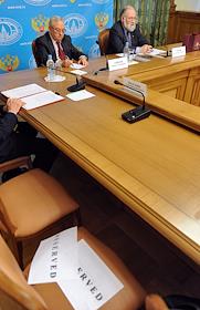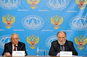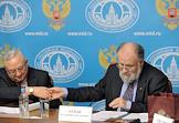 Посол по особым поручениям Министерства иностранных дел (МИД) России Анвар Азимов (слева) и председатель Центральной избирательной комиссии (ЦИК) России Владимир Чуров (справа) во время пресс-конференции на тему: "Итоги работы миссий по международному наблюдению за выборами в Государственную думу Федерального Собрания Российской Федерации 4 декабря 2011 года и президента Российской Федерации 4 марта 2012 года". Пресс-конференция прошла в пресс-центре МИД России.