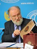 Председатель Центральной избирательной комиссии Владимир Чуров на пресс-конференции "Итоги работы миссий по международному наблюдению за выборами в Государственную Думу Федерального Собрания Российской Федерации 4 декабря 2011 года и Президента Российской Федерации 4 марта 2012 года". Пресс-конференция прошла в Пресс-центре МИД России.