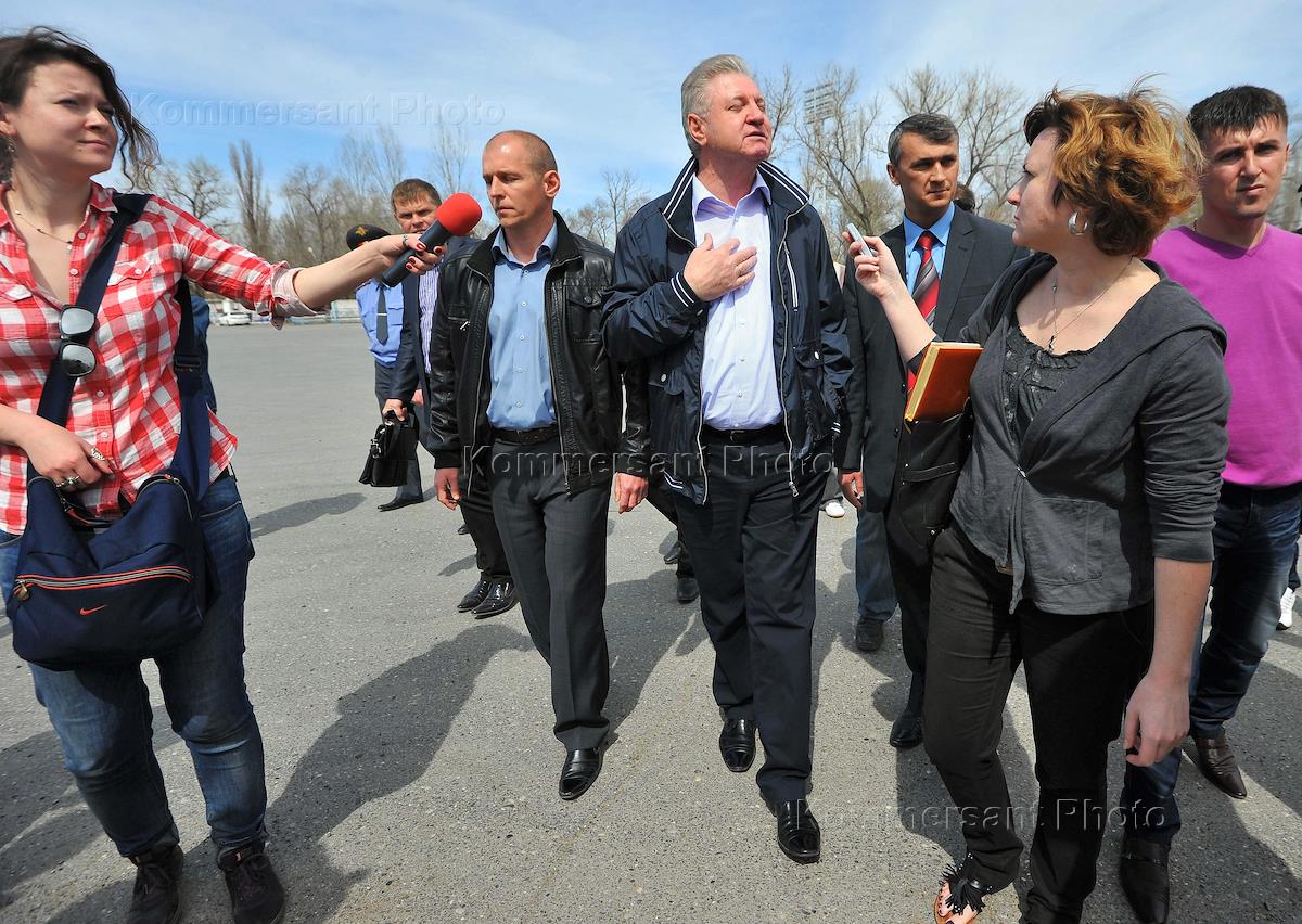 Бывший кандидат в мэры Астрахани Олег Шеин (в центре) и мэр Астрахани Михаил Столяров (справа) среди участников несанционированной забастовки автоперевозчиков Астрахини. Забастовка прошла на площади у "Центрального" стадиона.