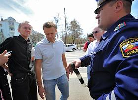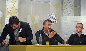 Бывший кандидат в мэры Астрахани Олег Шеин (слева), блогер Алексей Навальный (в центре) и мэр Астрахани Михаил Столяров (справа) среди участников несанционированной забастовки автоперевозчиков Астрахини. Забастовка прошла на площади у "Центрального" стадиона.