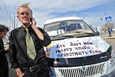 Несанционированная забастовка автоперевозчиков Астрахини на площади у "Центрального" стадиона. Наклейка на капоте маршрутного такси "Олег Шеин. Городу нужны перемены!".