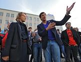 Бывший кандидат в мэры Астрахани Олег Шеин (слева) и блогер Алексей Навальный (в центре) среди участников несанционированной забастовки автоперевозчиков Астрахини. Забастовка прошла на площади у "Центрального" стадиона.