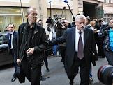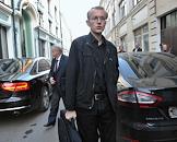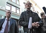 Бывший кандидат в мэры Астрахани Олег Шеин (слева) и лидер партии "Справедливая Россия" Сергей Миронов (в центре) у здания Центральной избирательной комиссии (ЦИК) России перед просмотром видеозаписи с избирательных участков Астрахани в день выборов мэра.