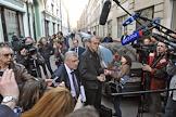 Лидер партии "Справедливая Россия" Сергей Миронов (второй слева) и бывший кандидат в мэры Астрахани Олег Шеин (справа) у здания Центральной избирательной комиссии (ЦИК) России перед просмотром видеозаписи с избирательных участков Астрахани в день выборов мэра.
