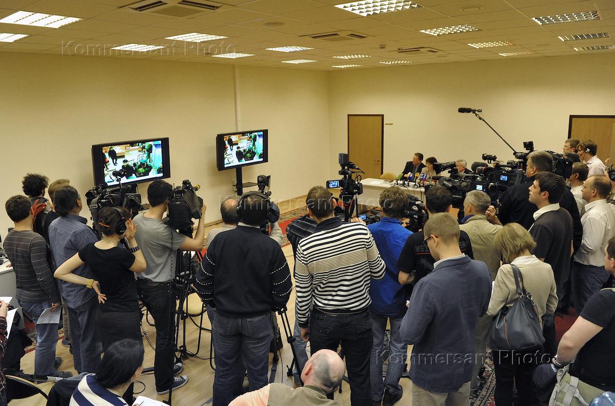 Журналисты во время просмотра членами Центральной избирательной комиссии (ЦИК) России видеозаписи с избирательных участков Астрахани в день выборов мэра.