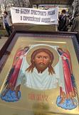 Митинг "За Родину, веру, суверенитет!", организованный православной общественностью, прошел на Пушкинской площади. Плакат "Убрать разврат с телеэкранов!".