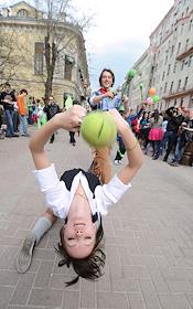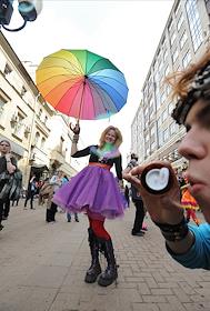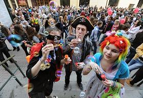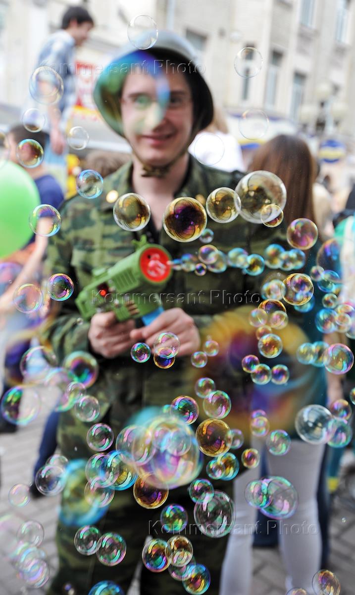 Участники ежегодного парада мыльных пузырей Dreamflash (Дримфлеш) на Новом Арбате.