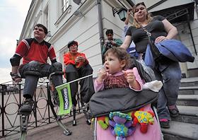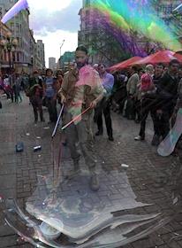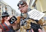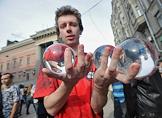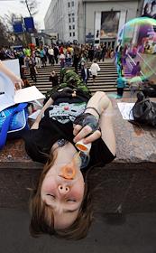 Участники ежегодного парада мыльных пузырей Dreamflash (Дримфлеш) на Новом Арбате. Табличка с надписью "За свободное приобретение и ношение крупнокалиберного оружия".