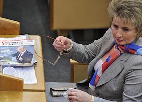 Заседание Государственной думы (ГД) России. Слева направо: председатель комитета ГД России по безопасности и противодействию коррупции Ирина Яровая, заместитель председателя комитета ГД России по аграрным вопросам Надежда Школкина и первый заместитель председателя комитета ГД России по вопросам семьи, женщин и детей Екатерина Семенова вовремя думского заседания.
