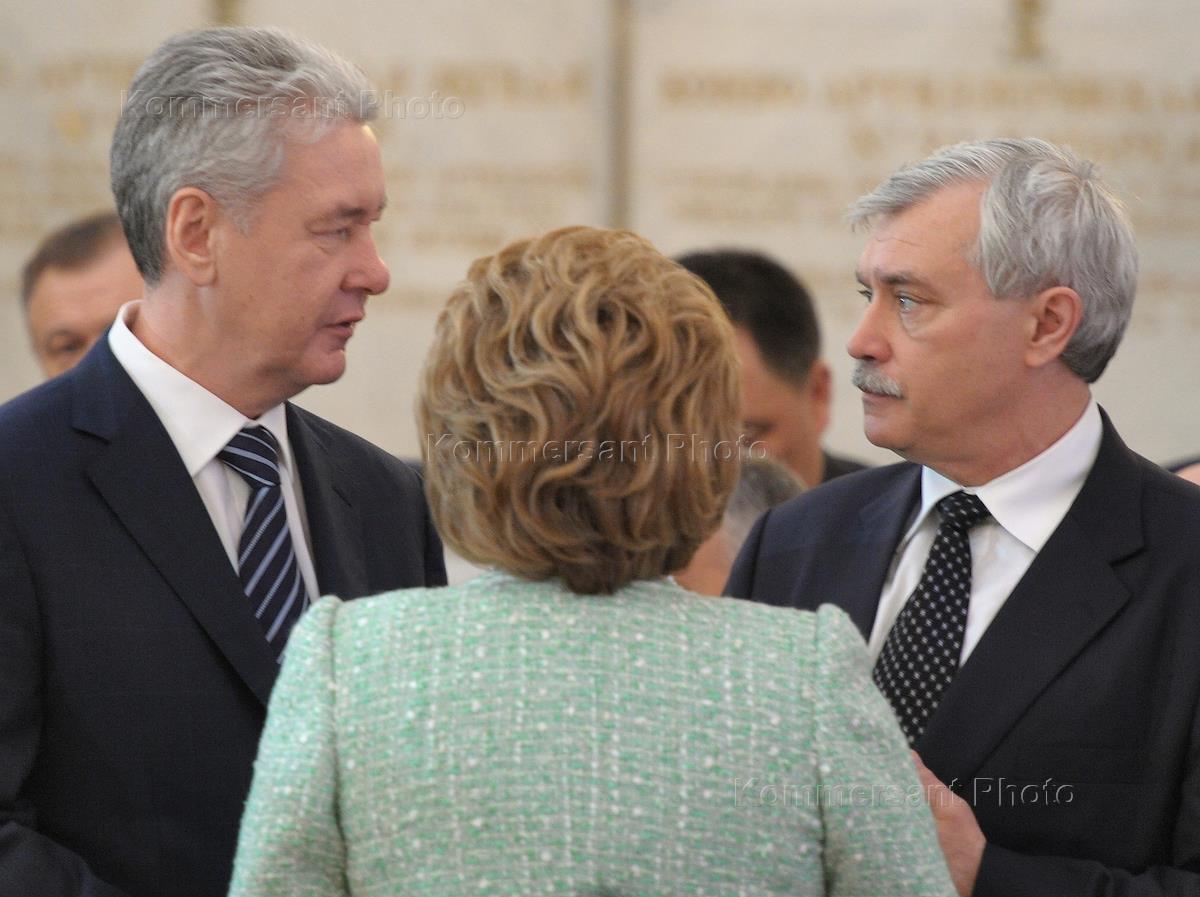 Государственный Совет в расширенном составе. Слева направо: мэр Москвы Сергей Собянин, председатель Совета Федерации России Валентина Матвиенко и губернатор Санкт-Петербурга Георгий Полтавченко во время заседания в Георгиевском зале Кремля.