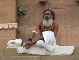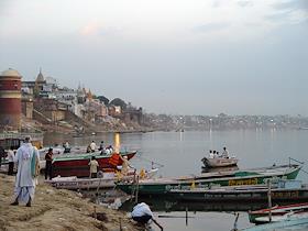 Виды Индии. Город Варанаси. Молитва перед утренним купанием в священной реке Ганг.