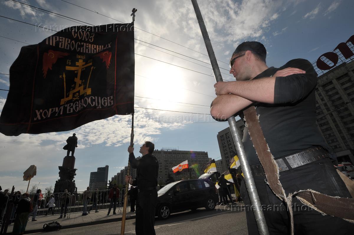 Участник первомайского шествия сторонников Коммунистической партии России (КПРФ), проходящего от Калужской до Театральной площади. Флаг с портретом Иисуса Христа и рекламный плакат МТС с портретом боксера Николая Валуева.