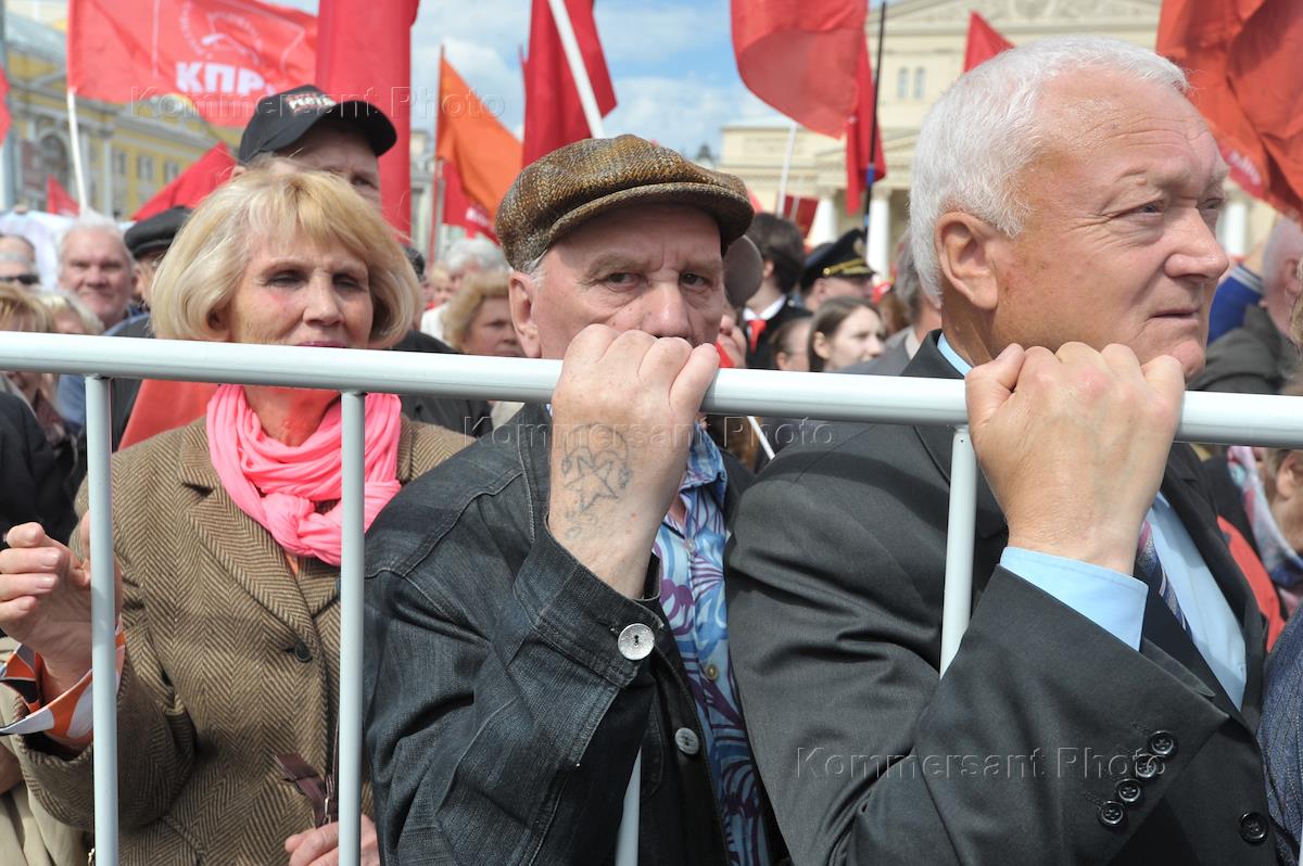 Лидер Коммунистической партии России (КПРФ) Геннадий Зюганов (в центре) среди участников первомайского шествия сторонников КПРФ, проходящего от Калужской до Театральной площади.