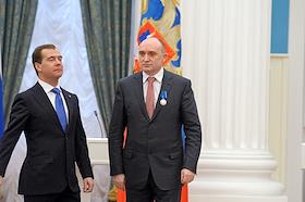 Президент России Дмитрий Медведев (слева) и генеральный директор ОАО "Магнитогорский металлургический комбинат" Борис Дубровский (справа) во время церемонии вручения государственных наград президентом России. Церемония прошла в Екатерининском зале Кремля.