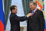 Президент России Дмитрий Медведев (слева) и генеральный директор Ростовского вертолетного производственного комплекса ОАО"Роствертол" Борис Слюсарь (справа) во ремя церемонии вручения государственных наград президентом России. Церемония прошла в Екатерининском зале Кремля.