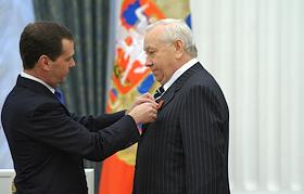 Президент России Дмитрий Медведев (слева) и первый заместитель главного конструктора ВНИИ Экспериментальной физики Виктор Нефедов (справа) во время церемонии вручения государственных наград президентом России. Церемония прошла в Екатерининском зале Кремля.