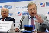 Председатель Счетной палаты России Сергей Степашин (в центре) и ректор Московского государственного университета имени М.В.Ломоносова Виктор Садовничий (справа) после интернет-конференция "Проблемы правоприменительной практики в системе финансового контроля Российской Федерации". Конференция прошла в информационном агенстве "Гарант".