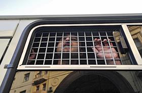 Акция "Не пустим вора в Кремль!", организованная штабом компании "За честную власть", прошла на Манежной площади. В автозаке задержаные участники акции.