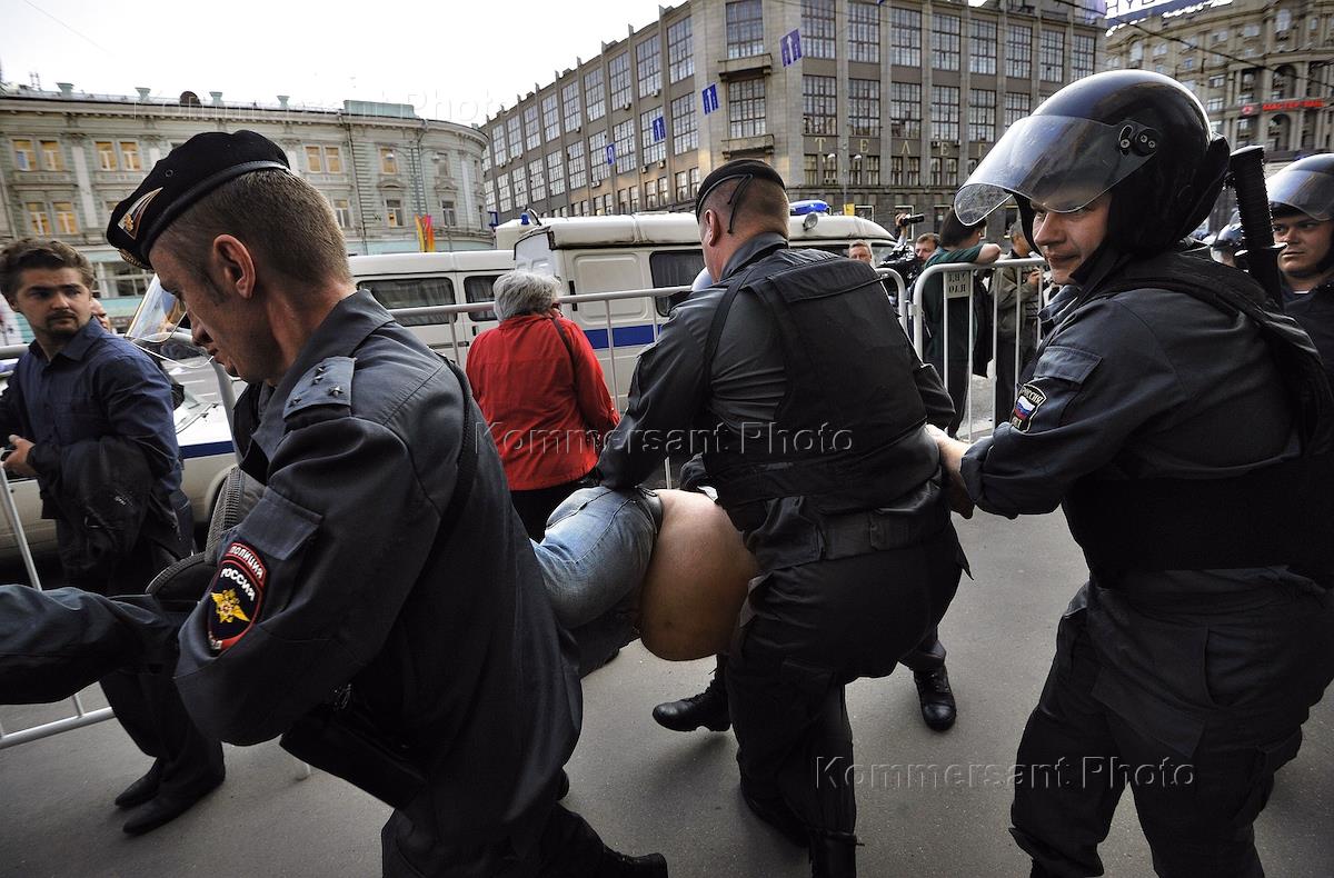 Сотрудники полиции во время задержания участника акции "Не пустим вора в Кремль!", организованной штабом компании "За честную власть" на Манежной площади.