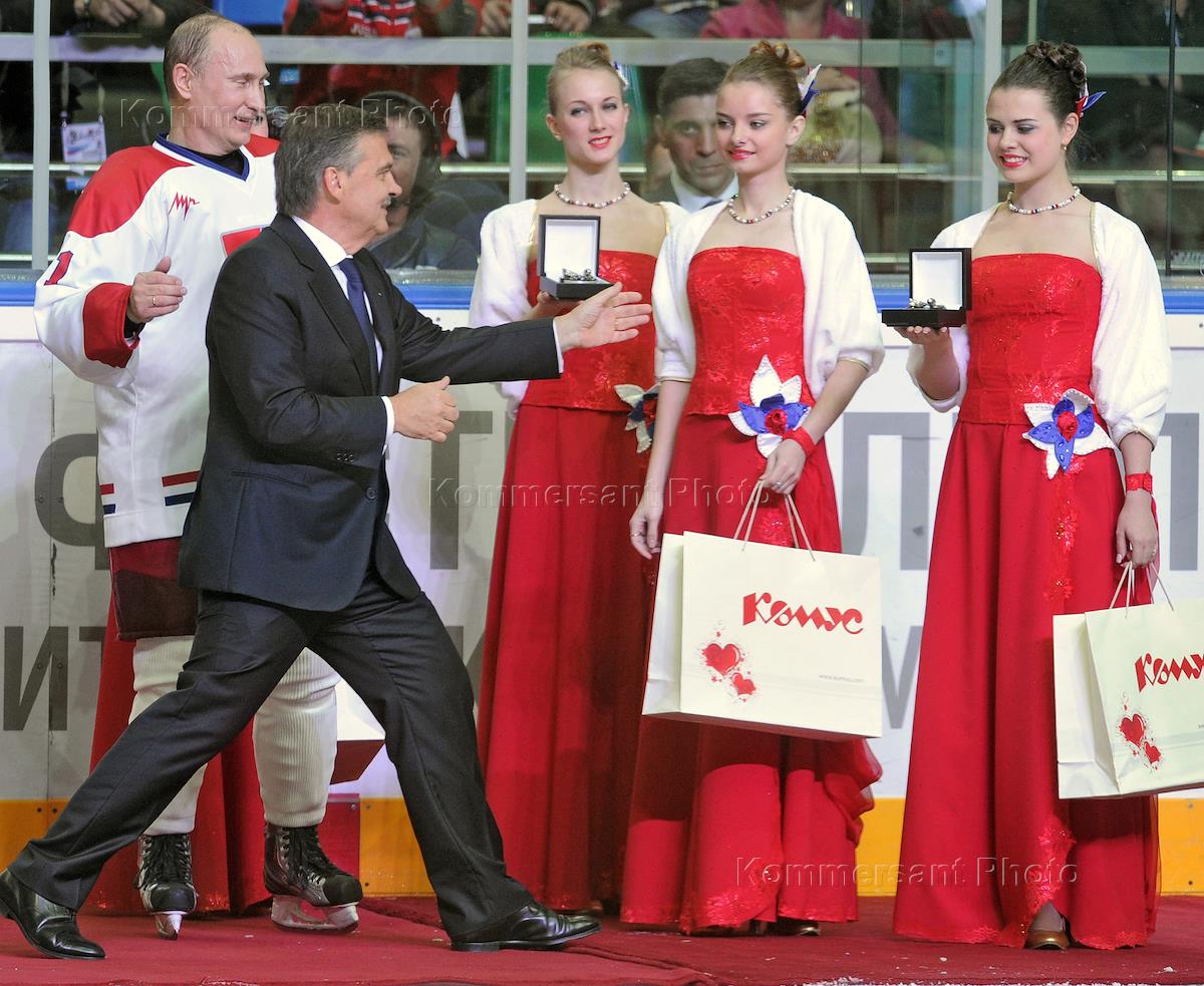 Финал любительской хоккейной лиги. Президент Международной федерации хоккея Рене Фазель (слева) и президент России Владимир Путин (справа) после матча между сборной Российской любительской хоккейной лиги (РЛХЛ) и сборной ветеранов отечественного хоккея. Матч прошел в Ледовом дворце "Мегаспорт".