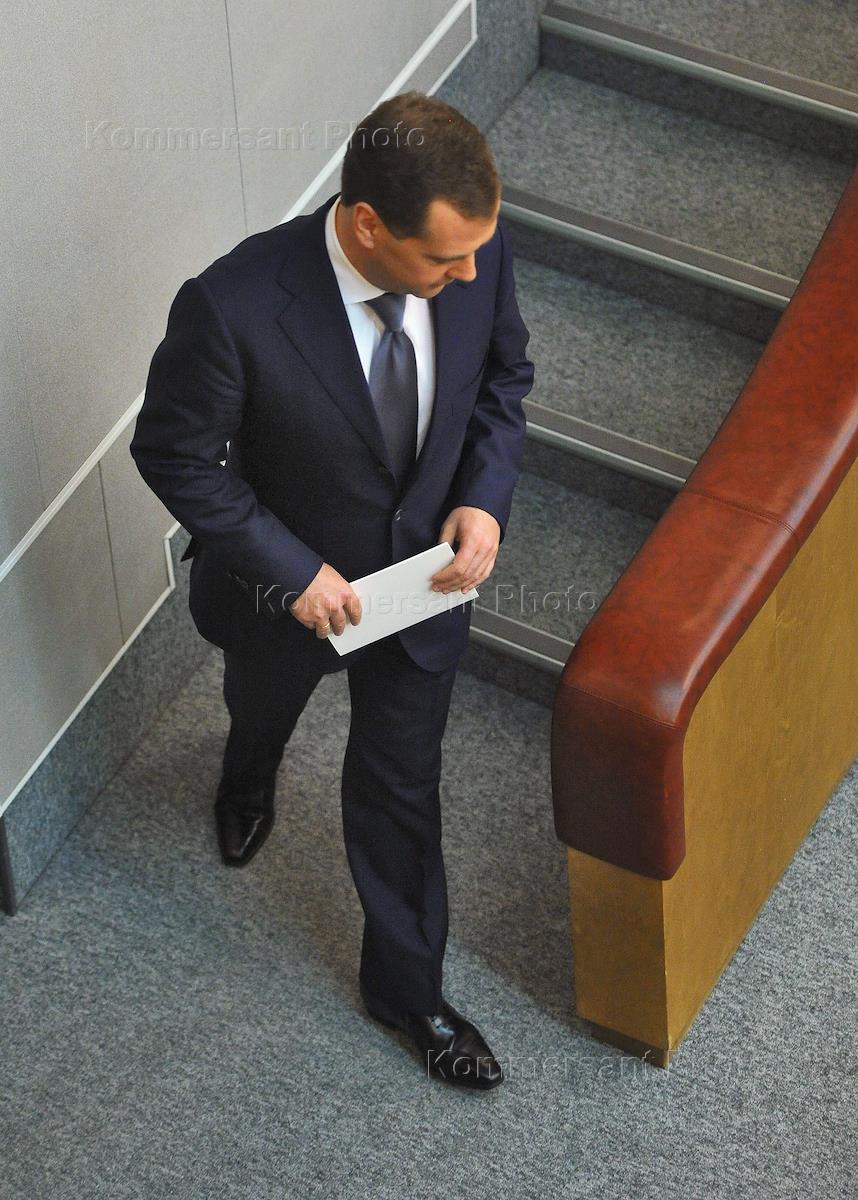 Дополнительное пленарное заседание Государственной думы России, на котором рассматривалась кандидатура нового председателя правительства России. Кандидат на пост председателя правительства России Дмитрий Медведев (слева) на заседании Госдумы.