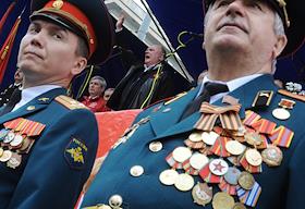 Лидер Коммунистической партии России Геннадий Зюганов (справа) во время проведения митинга в день 67-й годовщины Победы в Великой Отечественной войне. Митинг прошел на Лубянской площади.