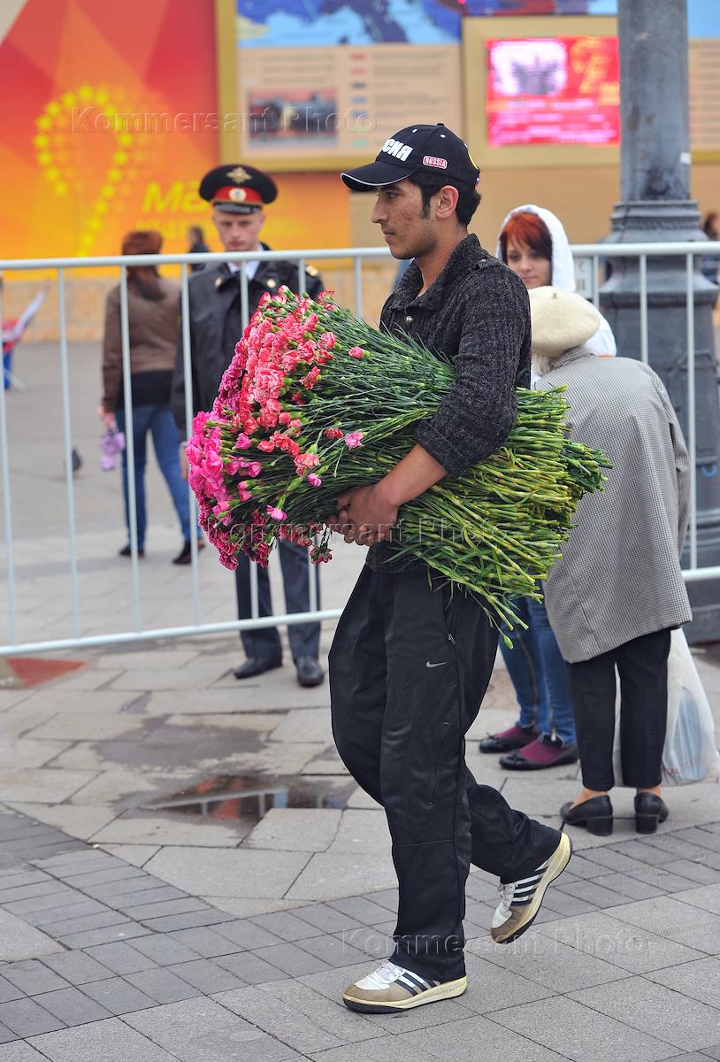 Жанровая фотография. Мужчина несет охапку гвоздик.