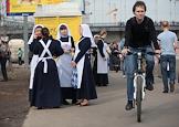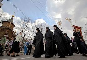 Жанровая фотография. Монахини во время Крестного хода по улице города.