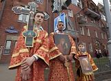 Жанровая фотография. Молодые люди - служки (прислуживающий в храме) с иконами и крестом во время Крестного хода по улице города.