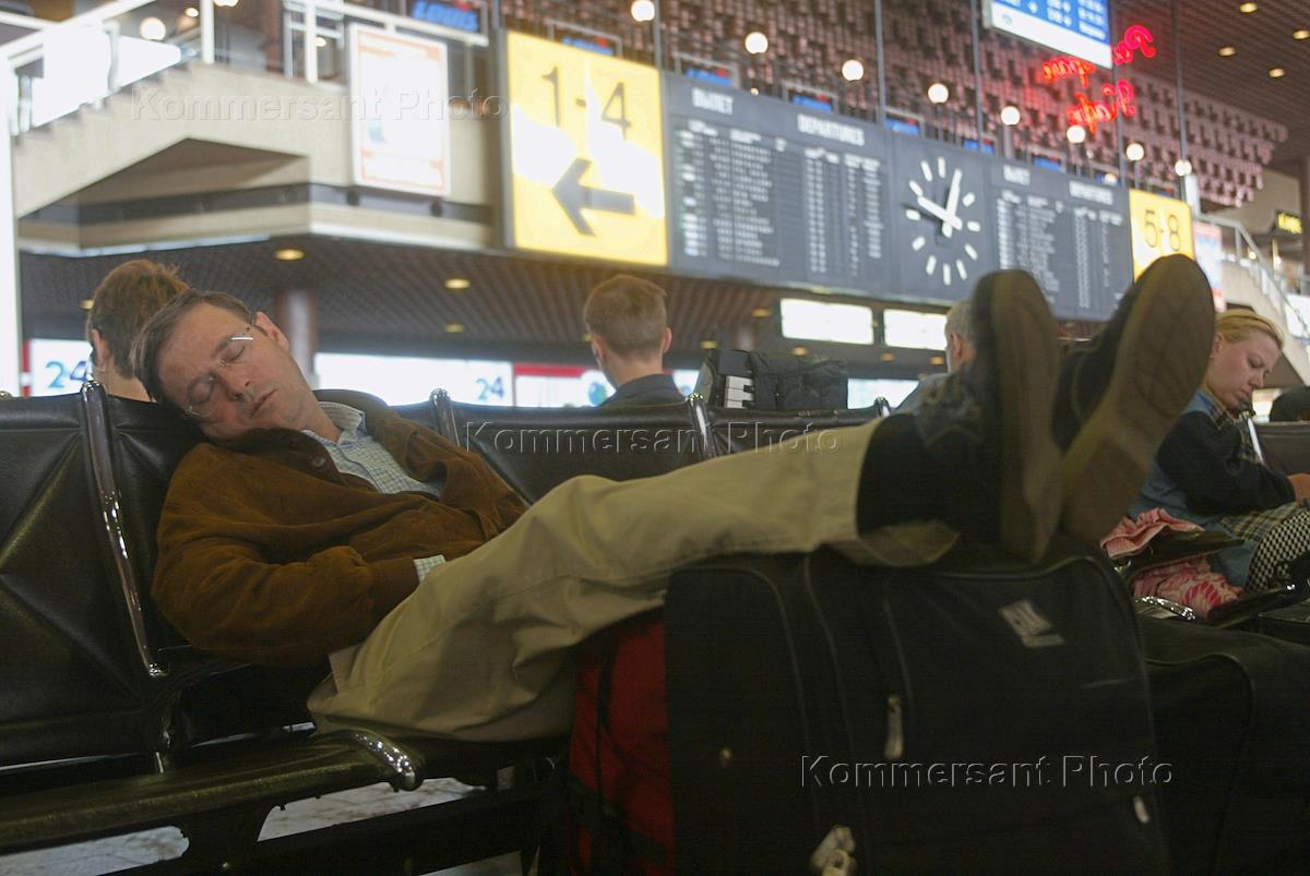 A passenger waits for his flight departure in the Sheremetyevo-2 airport lobby.