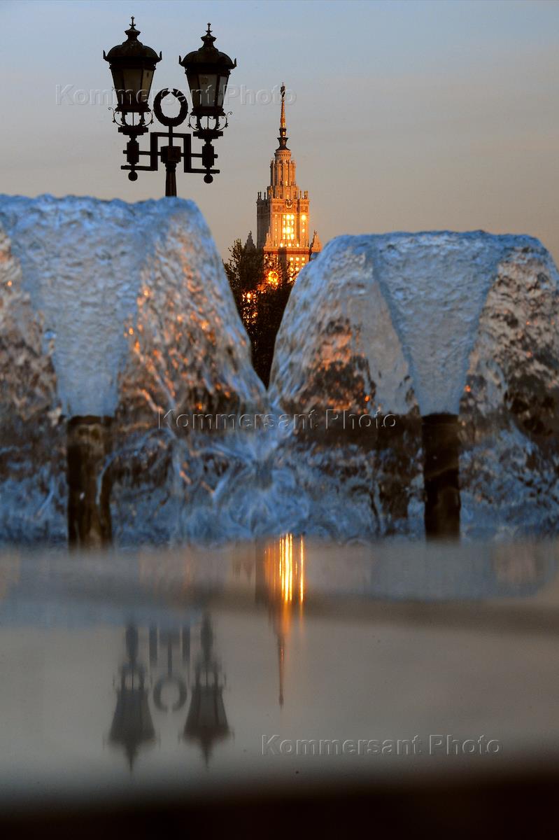 Виды Москвы. Фонтаны мемориала Победы на Поклонной горе. Шпиль Главного корпуса Московского государственного университета (МГУ) имени Ломоносова.