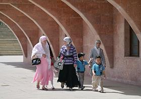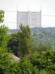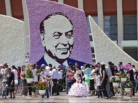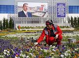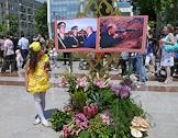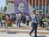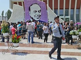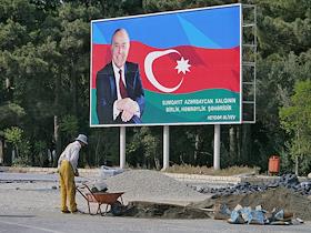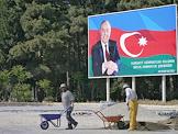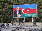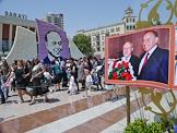 Виды Сумгаита. Плакат с портретом бывшего президента Азербайджана Гейдара Алиева на центральной площади города.