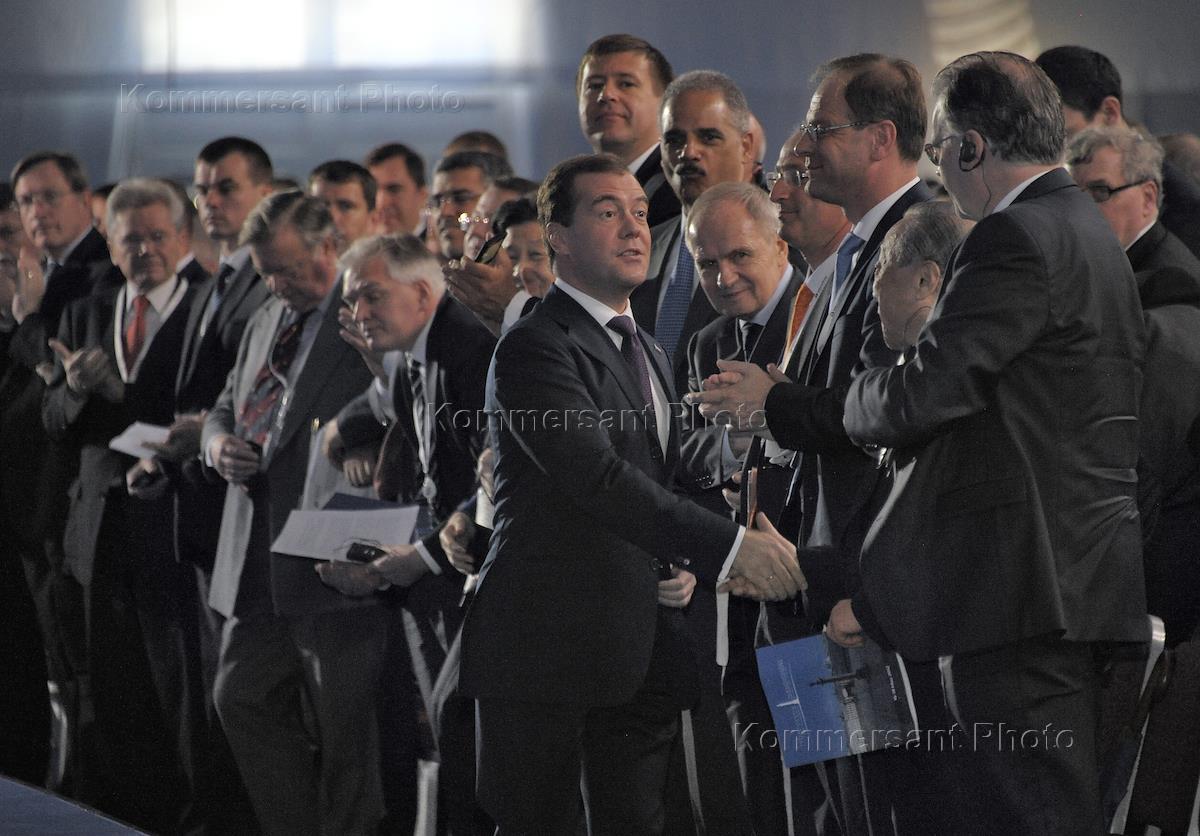 Председатель правительства России Дмитрий Медведев (в центре) и генеральный прокурор - министр юстиции США Эрик Холдер (справа) на церемонии открытия Международного юридического форума. Форум на тему: "Правовая политика в ХХI веке: новые вызовы права в глобальном мире" прошел в здании Главного Штаба на Дворцовой площади.