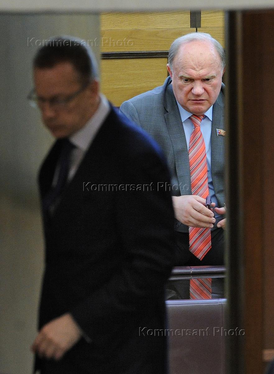 Полномочный представитель правительства России в Государственной думе Андрей Логинов (слева) и лидер Коммунистической партии России (КПРФ) Геннадий Зюганов (справа) во время заседания Госдумы.