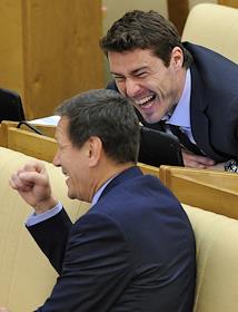 Первый заместитель председателя Государственной думы России Александр Жуков и член комитета ГД по делам общественных объединений и религиозных организаций Марат Сафин (справа) во время заседания Госдумы.