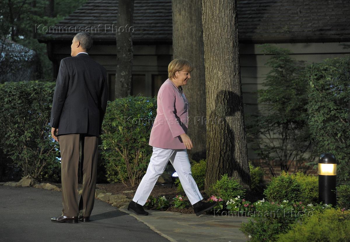 Саммит G8 ("Большой восьмерки") в Кэмп Дэвиде. Президент США Барак Обама (слева) и Федеральный канцлер Германии Ангела Меркель (справа) перед началом заседания глав государств и правительств "Большой восьмерки" в загородной резиденции президента США Кэмп-Дэвиде.