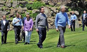 Саммит G8 ("Большой восьмерки") в Кэмп-Дэвиде. Слева направо: председатель Европейского Совета Нерман Ван Ромпей, премьер-министр Италии Марио Монти, премьер-министр Великобритании Дэвид Кэмерон, федеральный канцлер Германии Ангела Меркель, президент США Барак Обама, президент Фрации Франсуа Олланд, премьер-министр Канады Стивен Харпер, премьер-министр Японии Есихико Нода, председатель правительства России Дмитрий Медведев и председатель Европейской комиссии Жозе Мануэл Баррозу во время cовместного фотографирования.