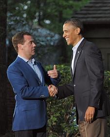 Саммит G8 ("Большой восьмерки") в Кэмп Дэвиде. Председатель правительства России Дмитрий Медведев (слева) и президент США Барак Обама (справа) перед началом заседания глав государств и правительств "Большой восьмерки" в загородной резиденции американского лидера Кэмп-Дэвиде.