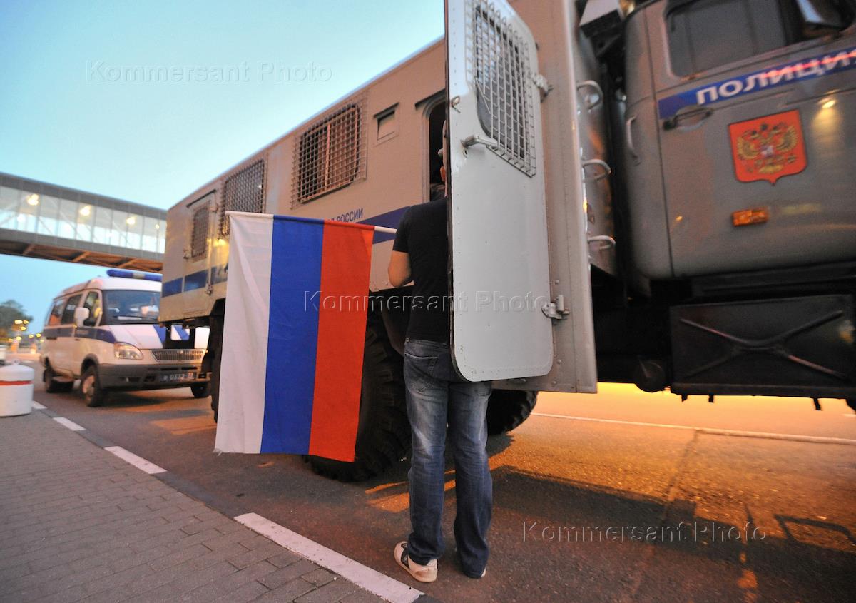 Встреча игроков сборной команды России по хоккею в аэропорту "Шереметьево" после возвращения с чемпионата мира в Финландии/Швеции. Сборная команда России завоевала золото чемпионата. Полицейский автомобиль для перевозки задержанных у здания аэропорта.