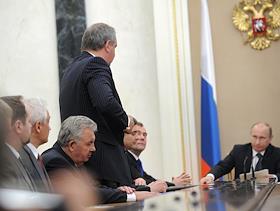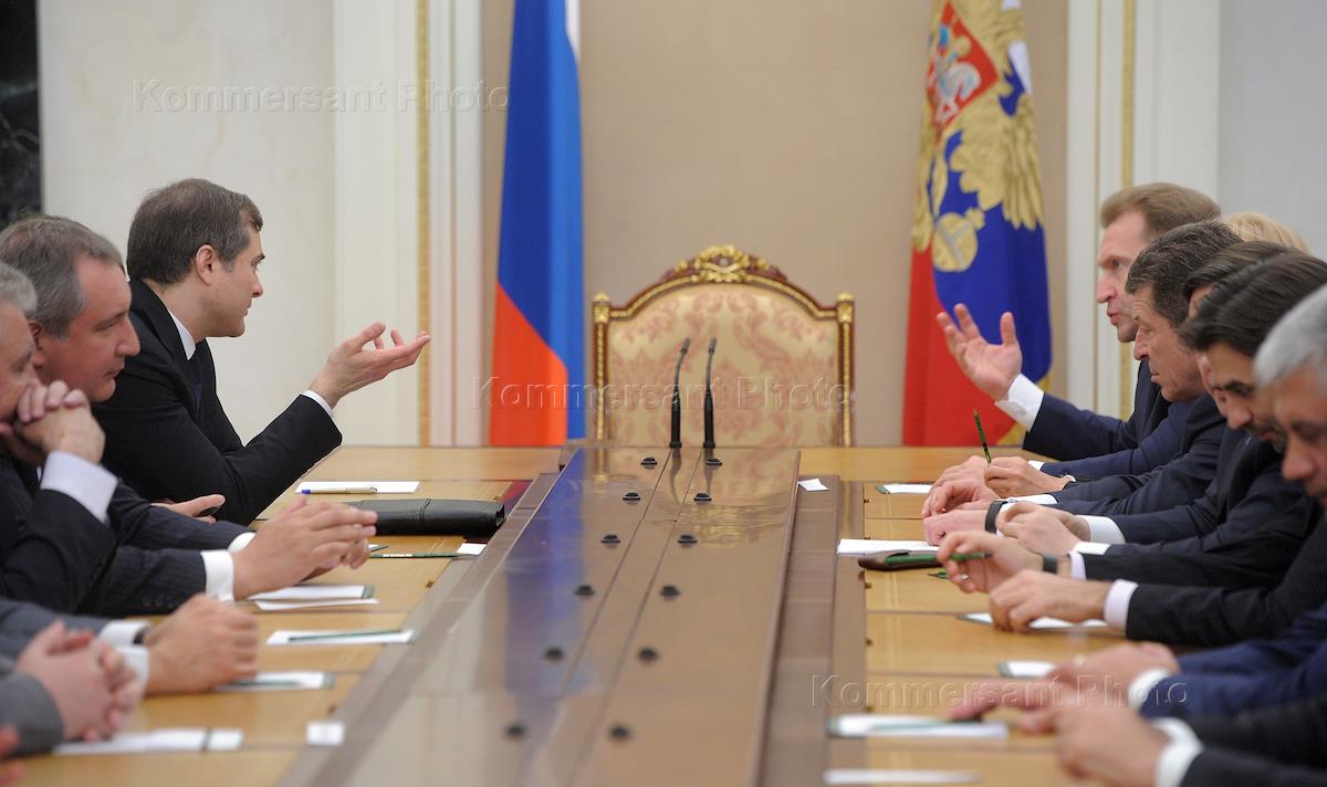 Церемония представления членов нового правительства России в Кремле. Президент России Владимир Путин (справа) и заместитель председателя правительства России Дмитрий Рогозин (слева) во время церемонии.