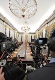 Церемония представления членов нового правительства России в Кремле. Слева направо: заместитель председателя правительства России Аркадий Дворкович, заместитель председателя правительства России, руководитель аппарата правительства Владислав Сурков, председатель правительства России Дмитрий Медведев и президент России Владимир Путин во время церемонии.
