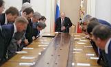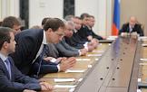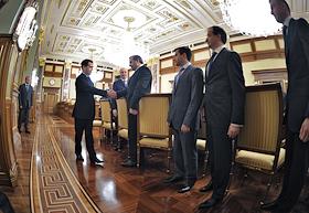 Церемония представления членов нового правительства России в Доме правительства. Слева направо: председатель правительства России Дмитрий Медведев, министр финансов Антон Силуанов, министр России по делам гражданской обороны, чрезвычайным ситуациям и ликвидации последствий стихийных бедствий Владимир Пучков, министр связи и массовых коммуникаций Николай Никифоров, министр культуры России Владимир Мединский и министр образования и науки Дмитрий Ливанов во время церемонии.