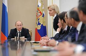 Церемония представления членов нового правительства России в Кремле. Президент России Владимир Путин (слева) и заместитель председателя правительства России Ольга Голодец (справа) во время церемонии.