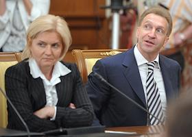 Церемония представление членов нового правительства России в Доме правительства. Заместитель председателя правительства Ольга Голодец (слева) и первый заместитель председателя правительства Игорь Шувалов (справа) во время церемонии.
