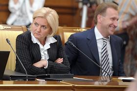 Церемония представления членов нового правительства России в Доме правительства. Заместитель председателя правительства России Ольга Голодец (слева) и министр здравоохранения и социального развития Вероника Скворцова (справа) во время церемонии.