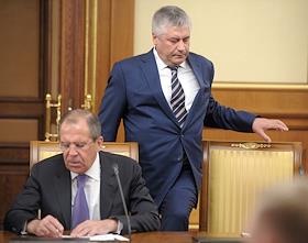 Церемония представления членов нового правительства России в Доме правительства. Министр промышленности и торговли Денис Мантуров (слева) и министр иностранных дел Сергей Лавров (справа) во время церемонии.