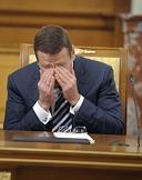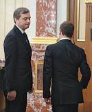 Церемония представления членов нового правительства России в Доме правительства. Председатель правительства России Дмитрий Медведев (слева) и министр труда и социальной защиты России Максим Топилин (справа) во время церемонии.