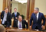 Церемония представление членов нового правительства России в Доме правительства. Слева направо: министр промышленности и торговли Денис Мантуров, председатель правительства Дмитрий Медведев, министр иностранных дел Сергей Лавров и министр внутренних дел Владимир Колокольцев во время церемонии.